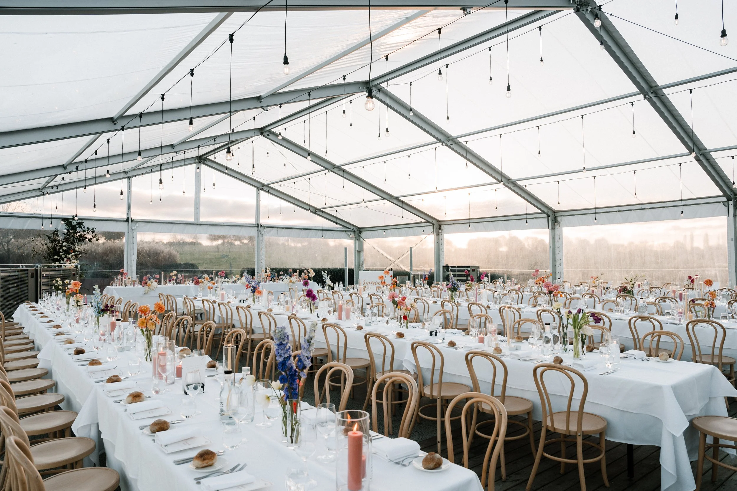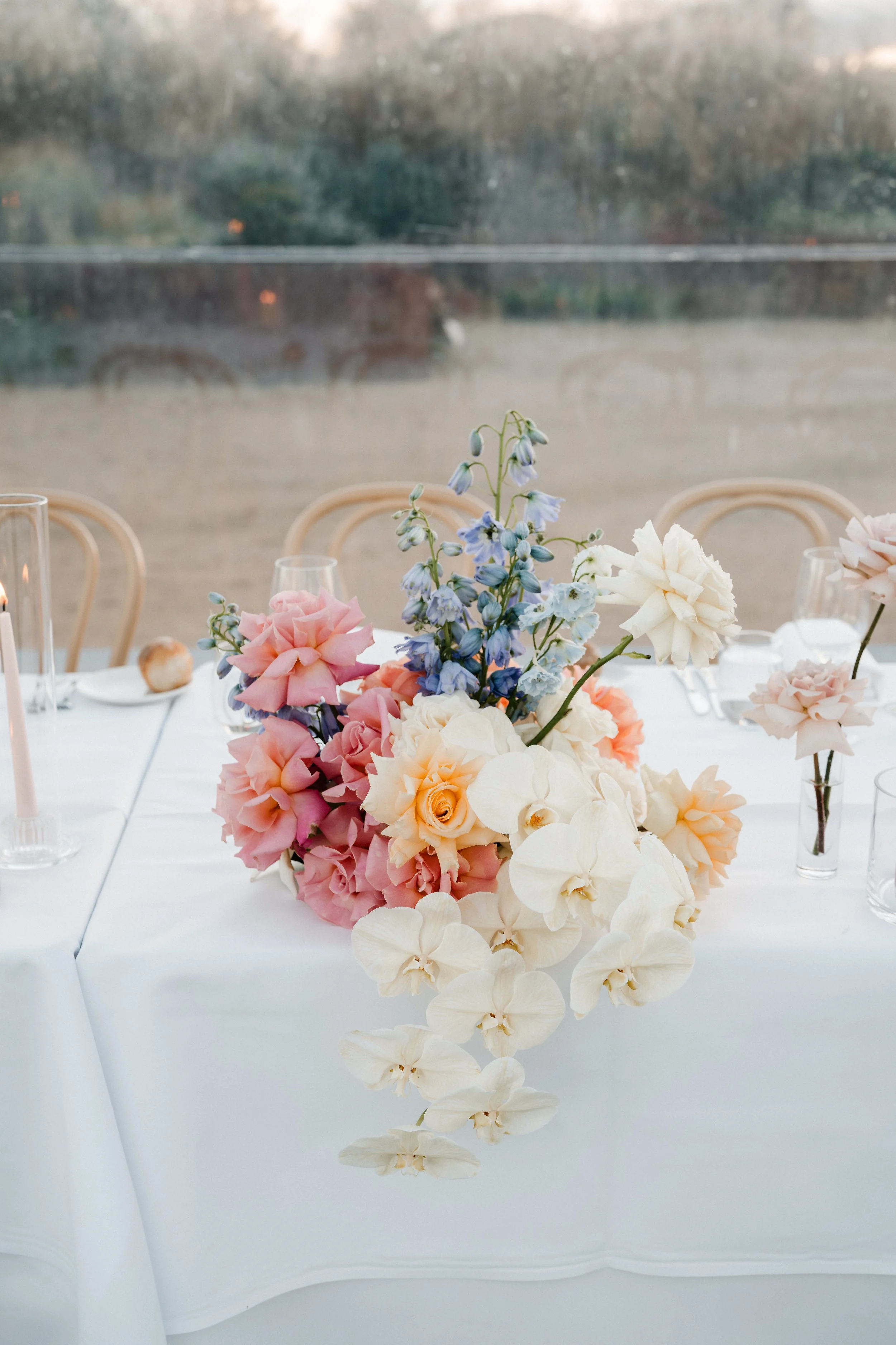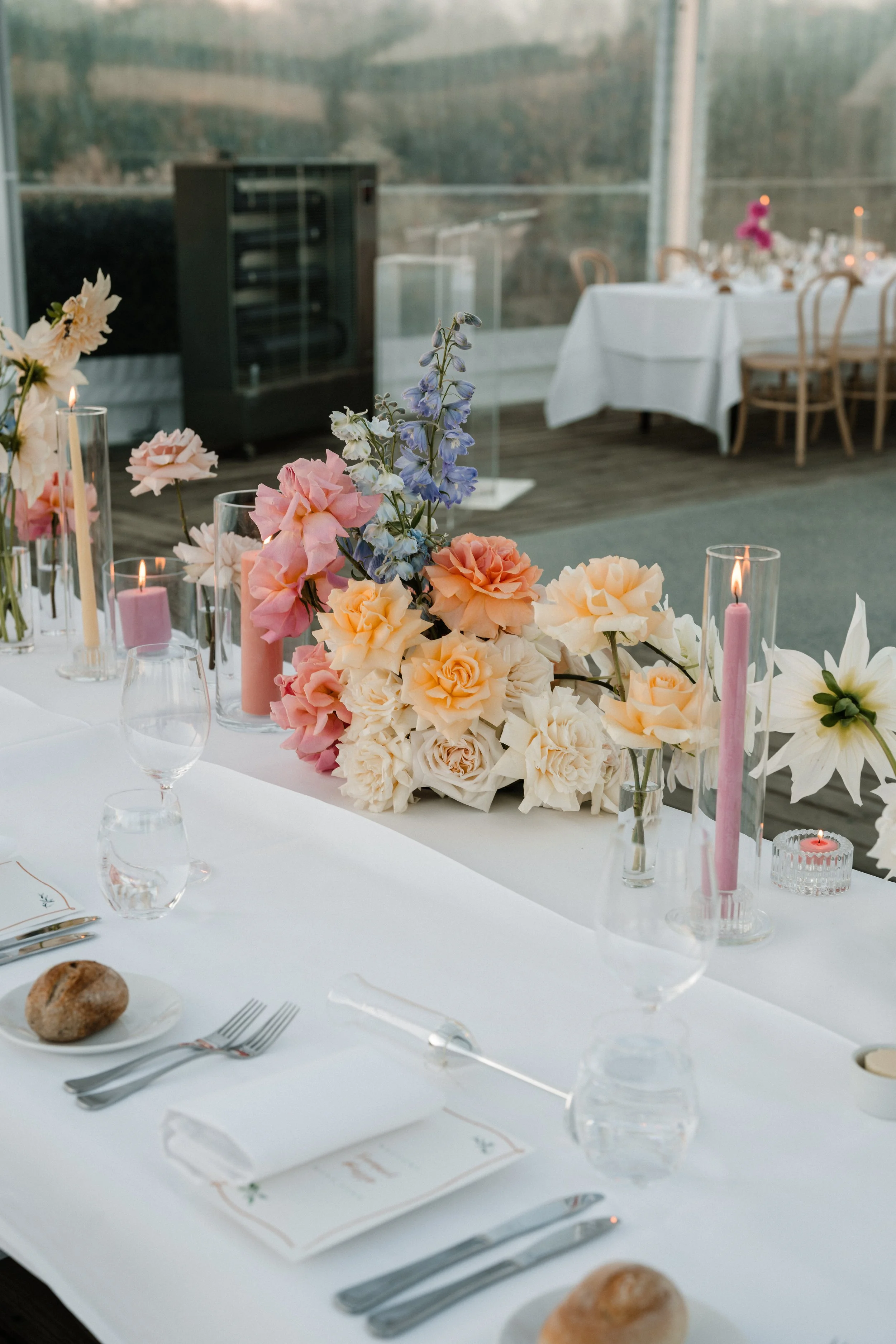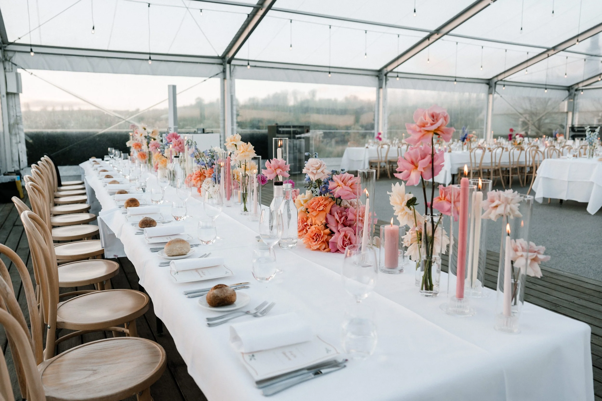 The ceremony used a modern neutral palette with greenery, framed by tall floral towers on the Croquet Lawn. For the reception, whimsical seasonal tones; orange, yellow, pink, blue, dark pastels. These brought colour and movement to the room, with candle colours even being carefully matched precisely to the florals. Italian-inspired touches at cocktail hour, complete with an accordion player, tied the day together.