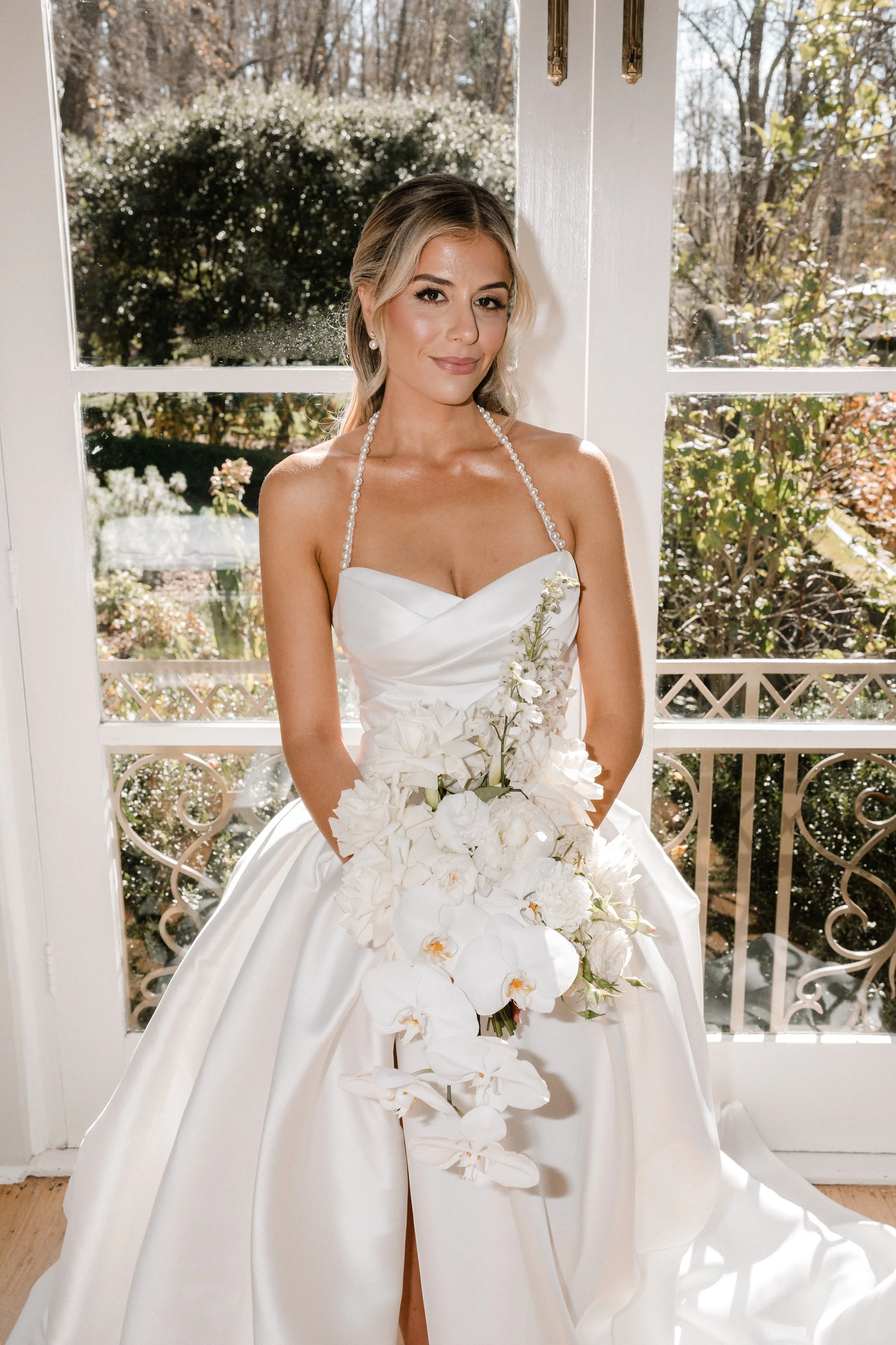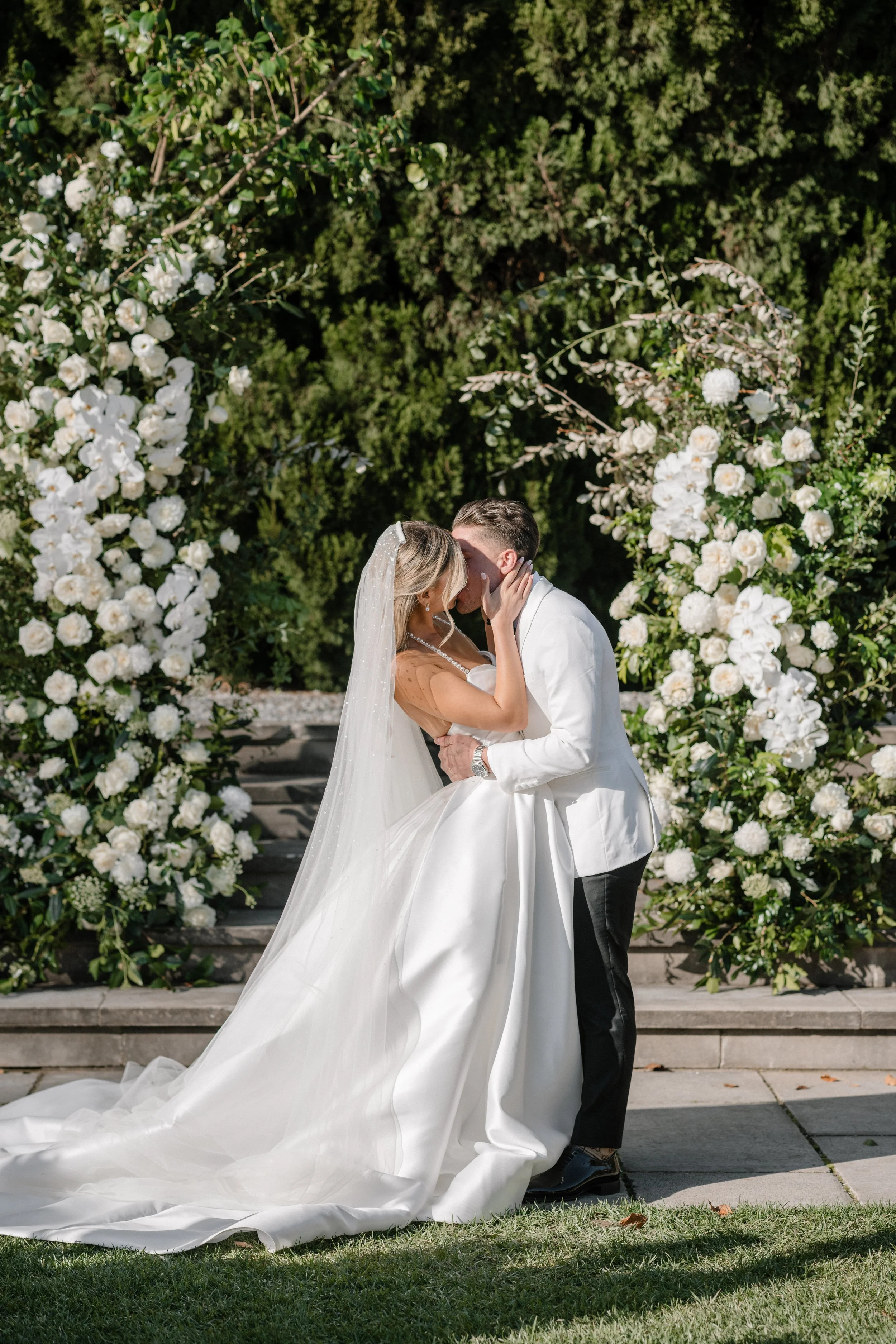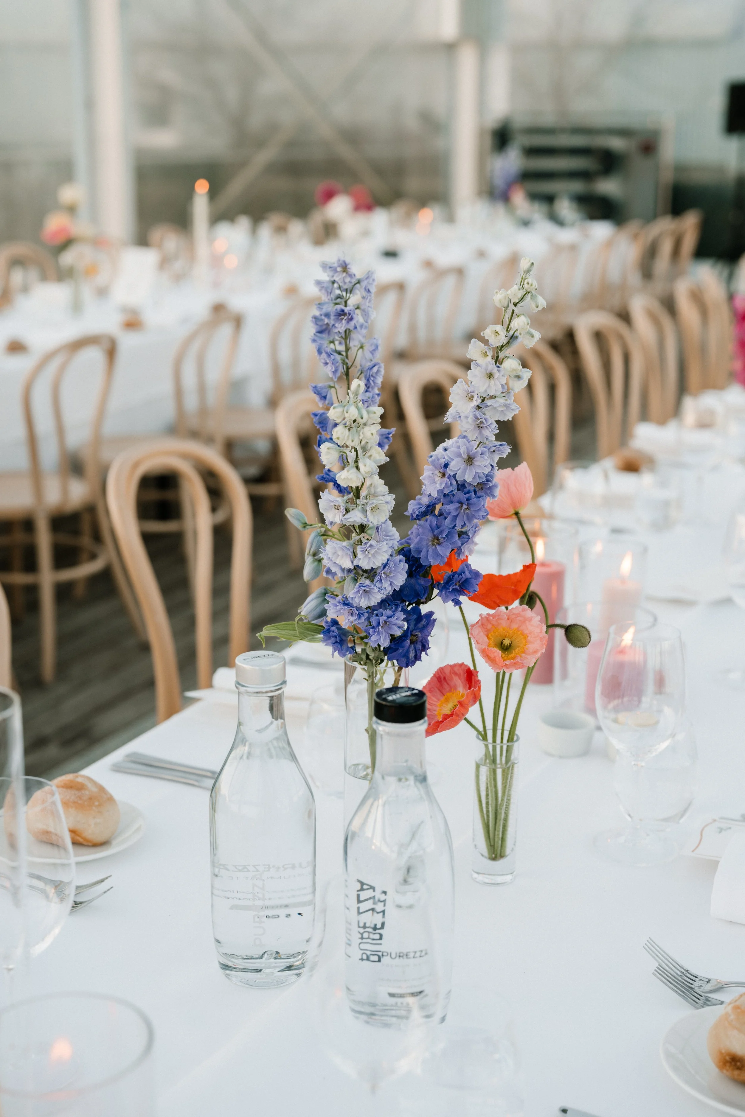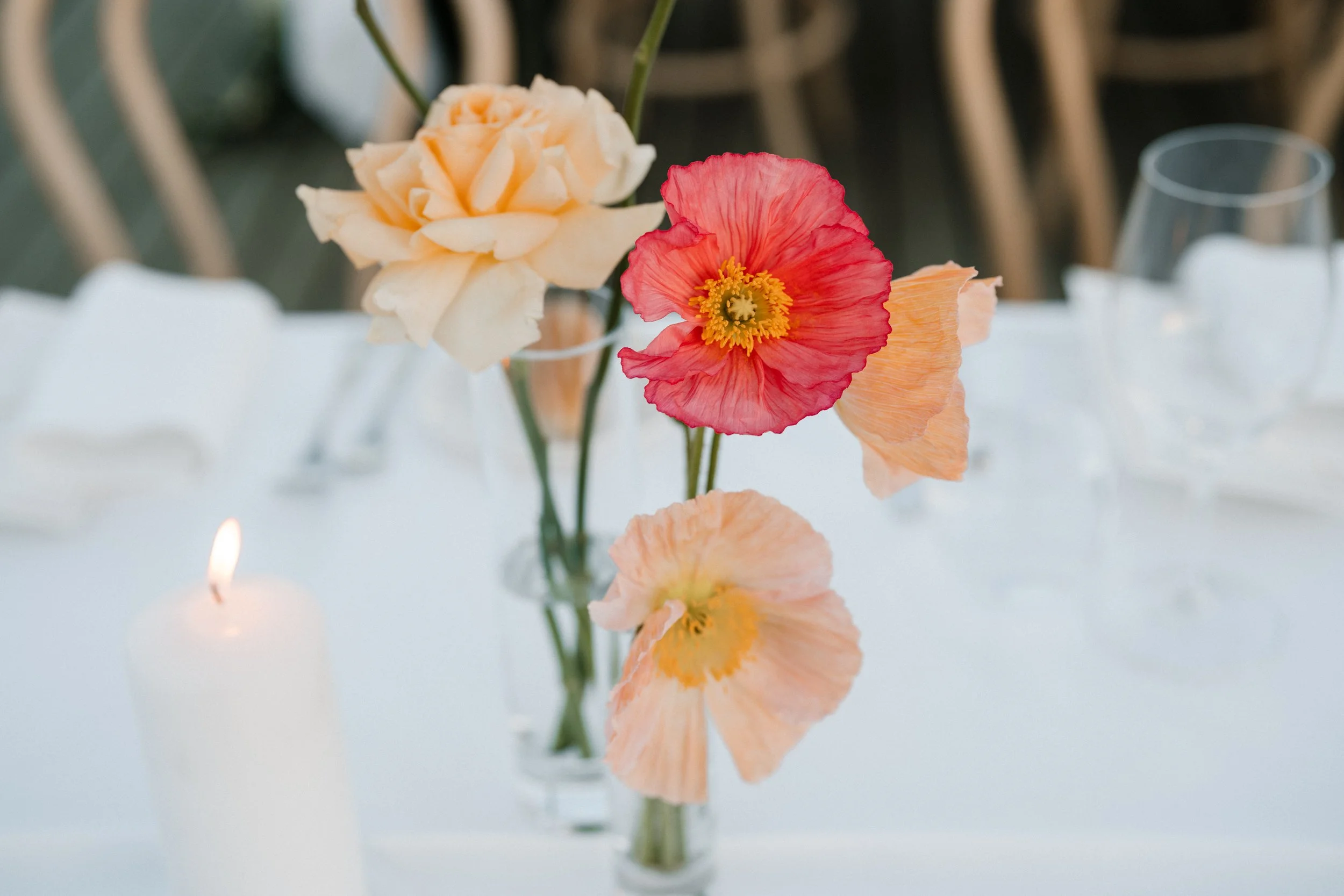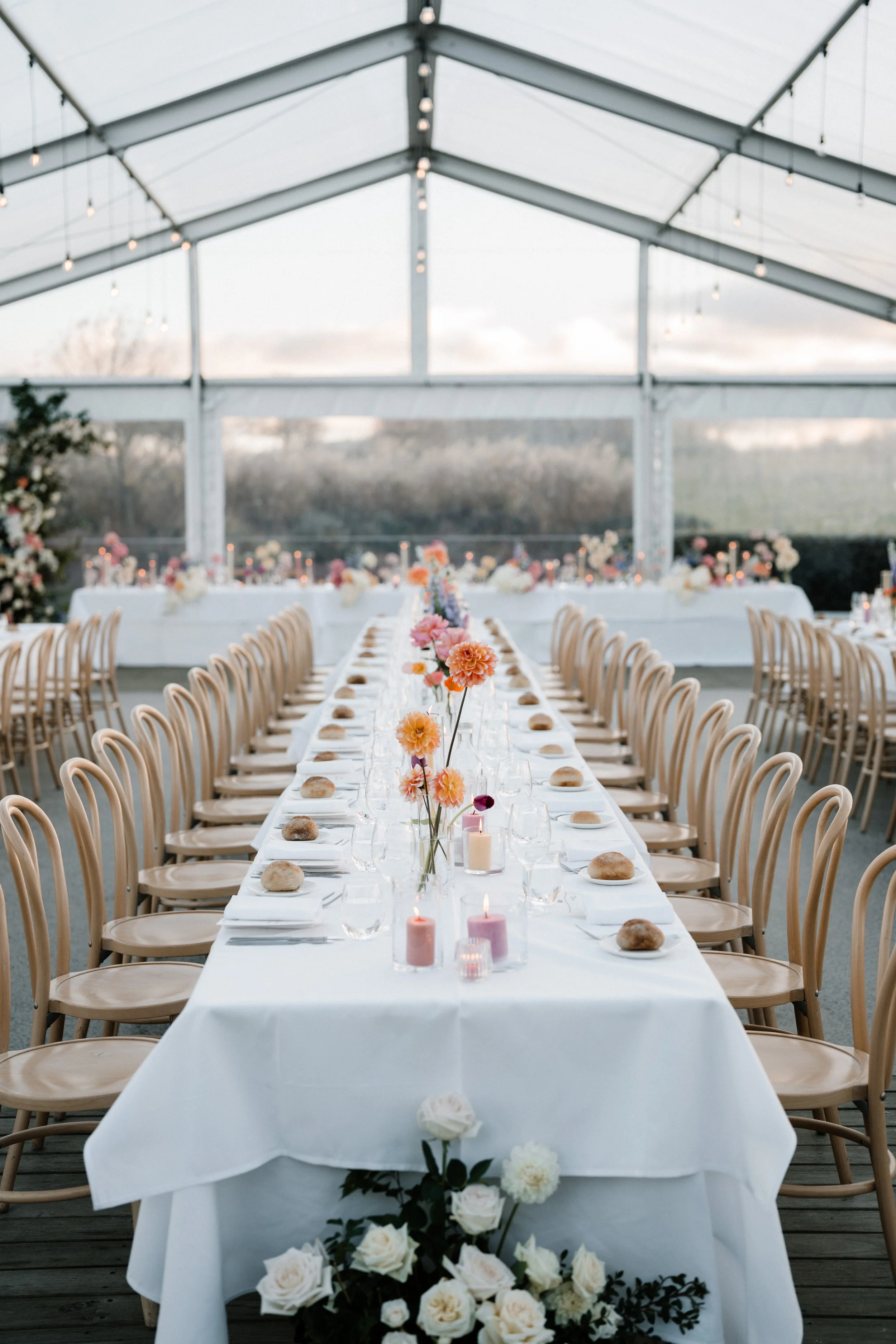 The ceremony used a modern neutral palette with greenery, framed by tall floral towers on the Croquet Lawn. For the reception, whimsical seasonal tones; orange, yellow, pink, blue, dark pastels. These brought colour and movement to the room, with candle colours even being carefully matched precisely to the florals. Italian-inspired touches at cocktail hour, complete with an accordion player, tied the day together.