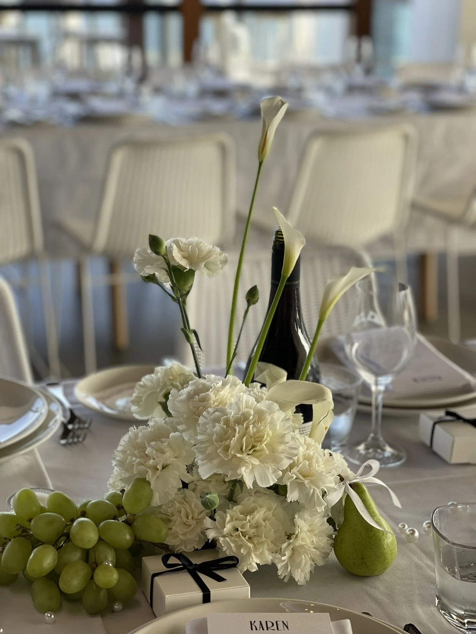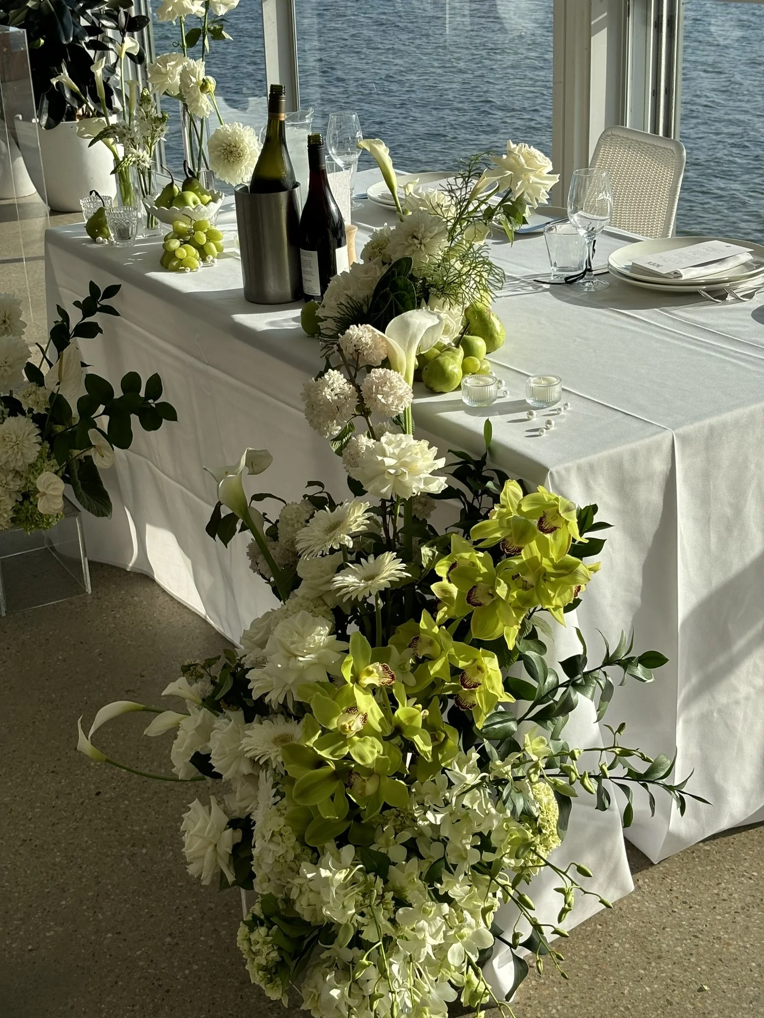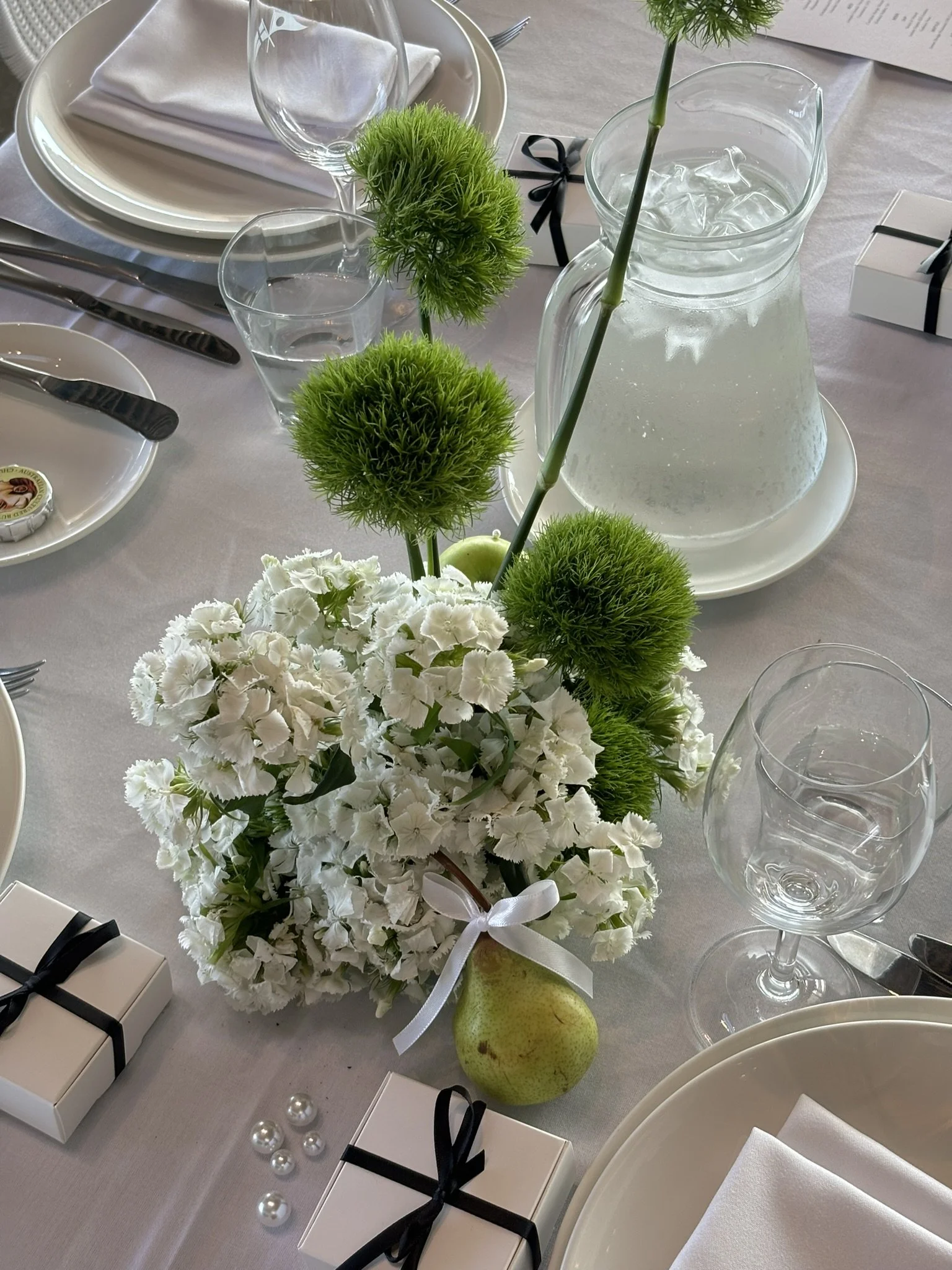 Their wedding design was modern and creative yet subtle. Each table featured sculptural, unique arrangements with minimal floral variety to highlight form and shape. Accents of pearls and ribbons tied the look together, giving the reception a refined designer edge against its waterside backdrop.