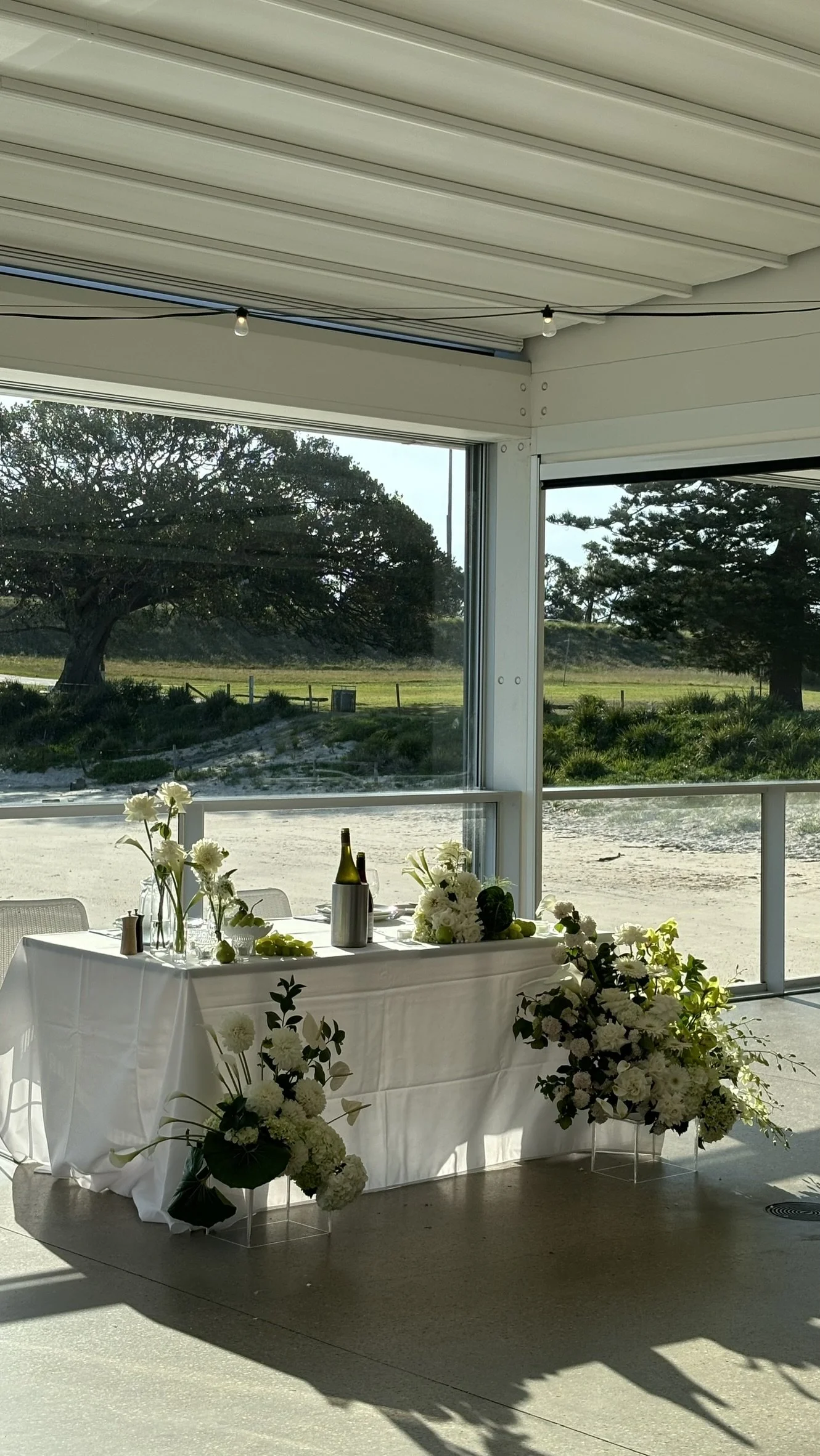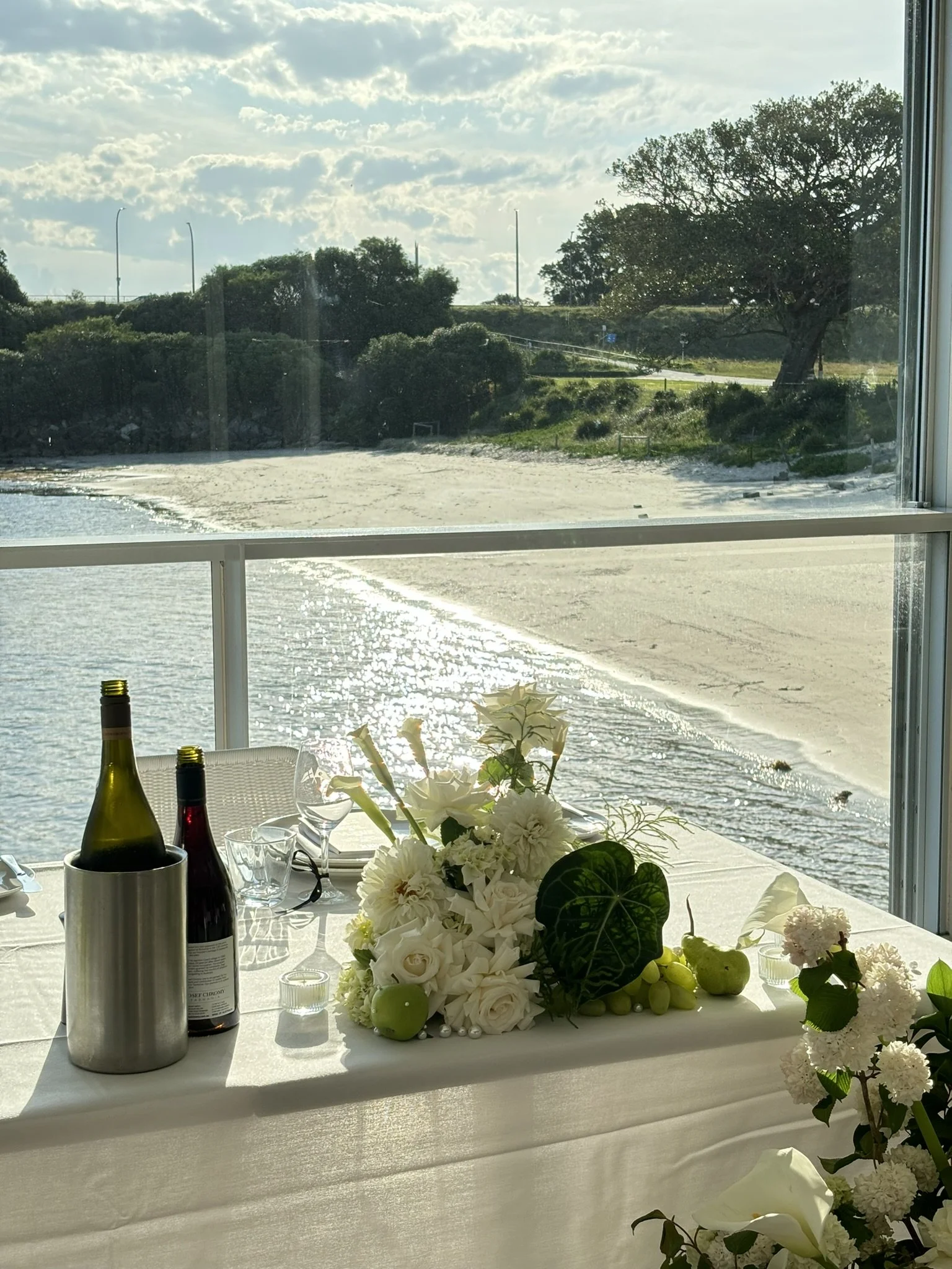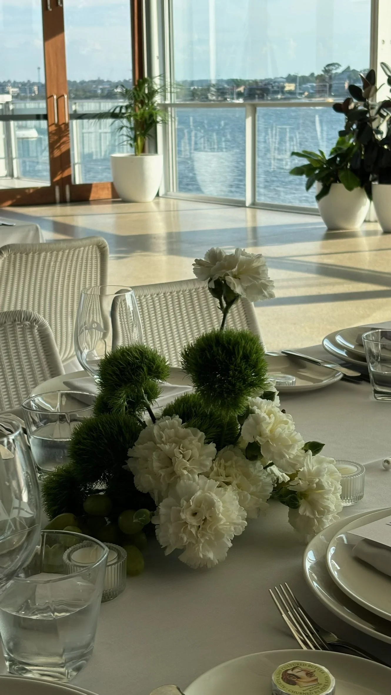 Their wedding design was modern and creative yet subtle. Each table featured sculptural, unique arrangements with minimal floral variety to highlight form and shape. Accents of pearls and ribbons tied the look together, giving the reception a refined designer edge against its waterside backdrop.