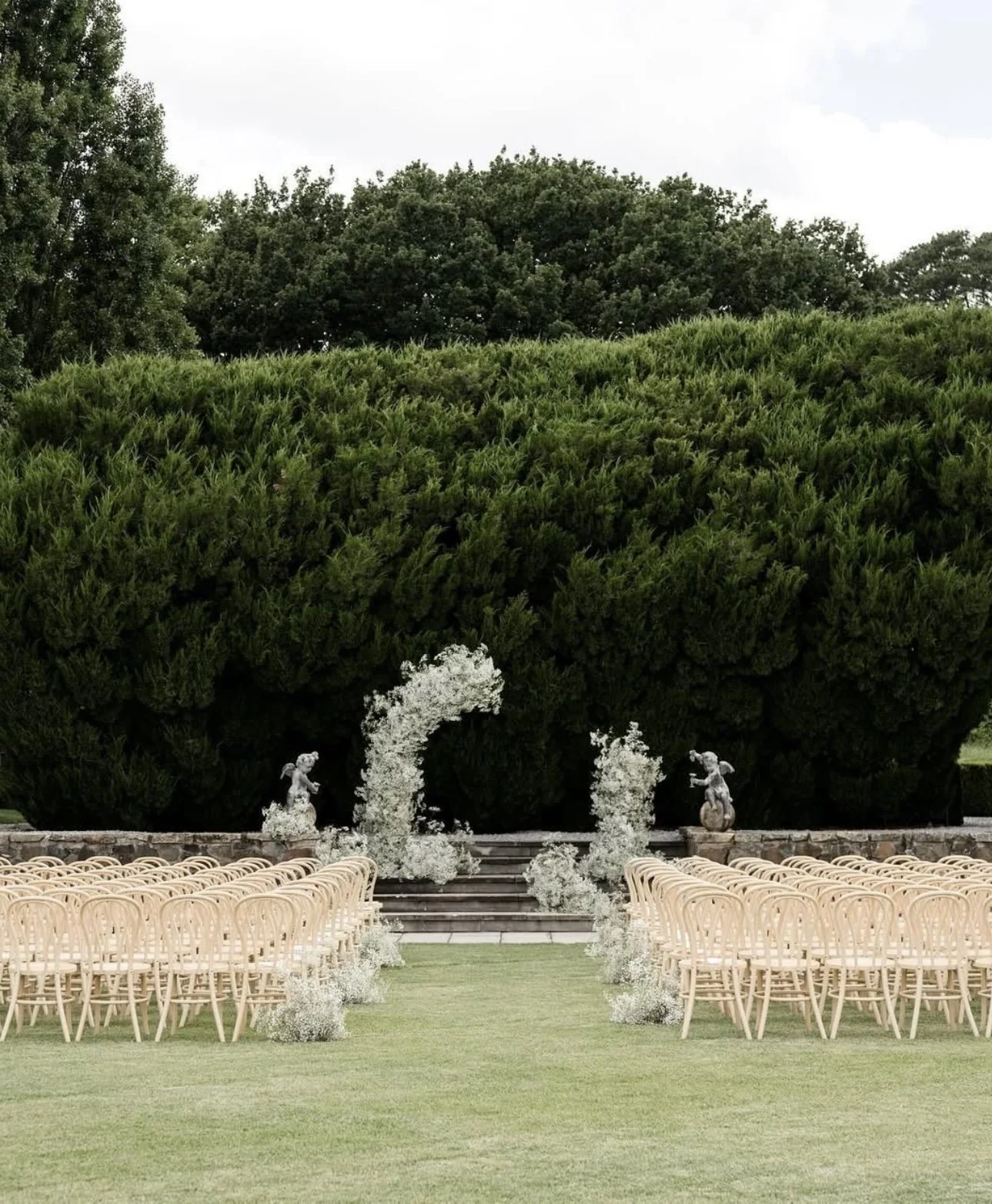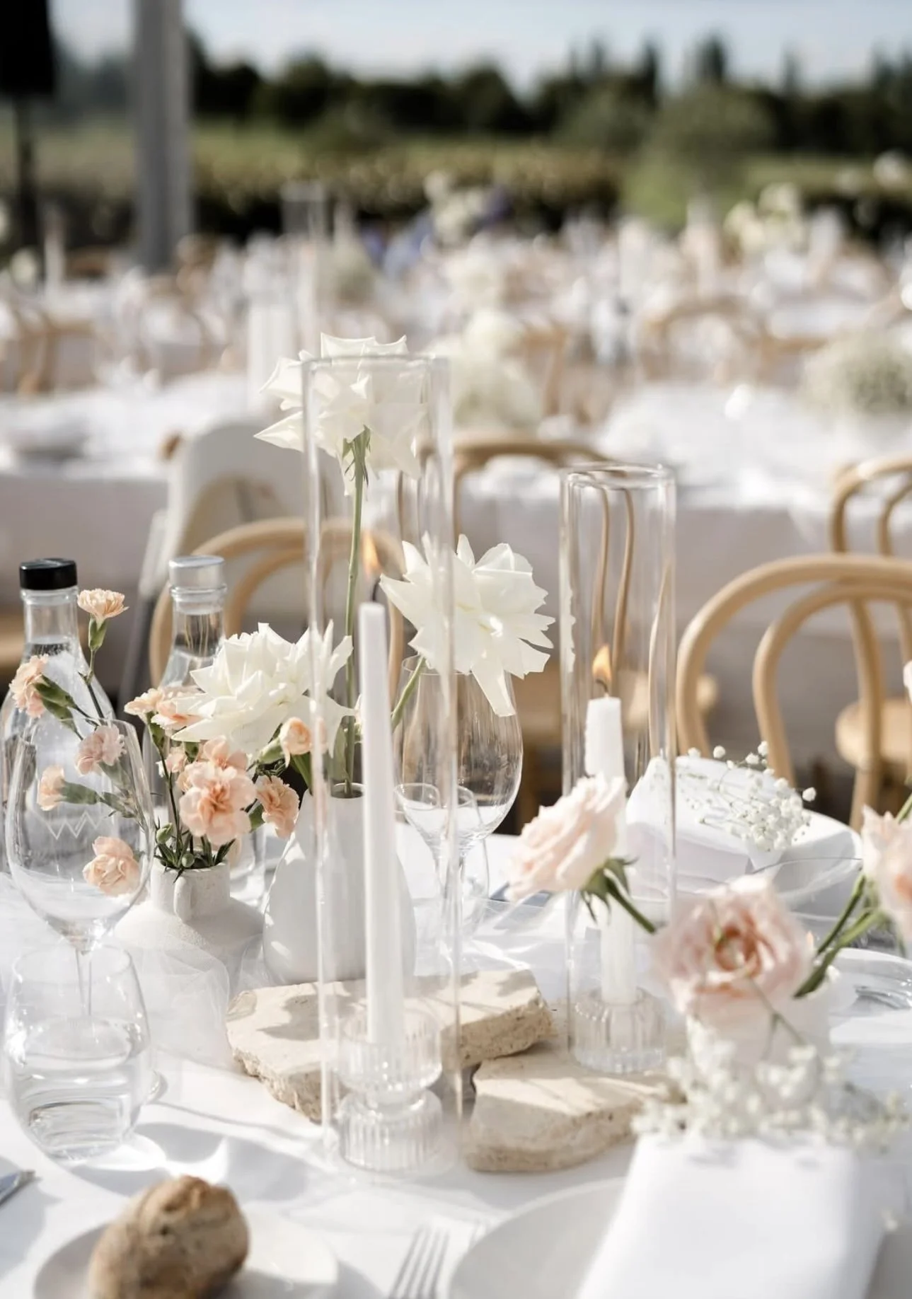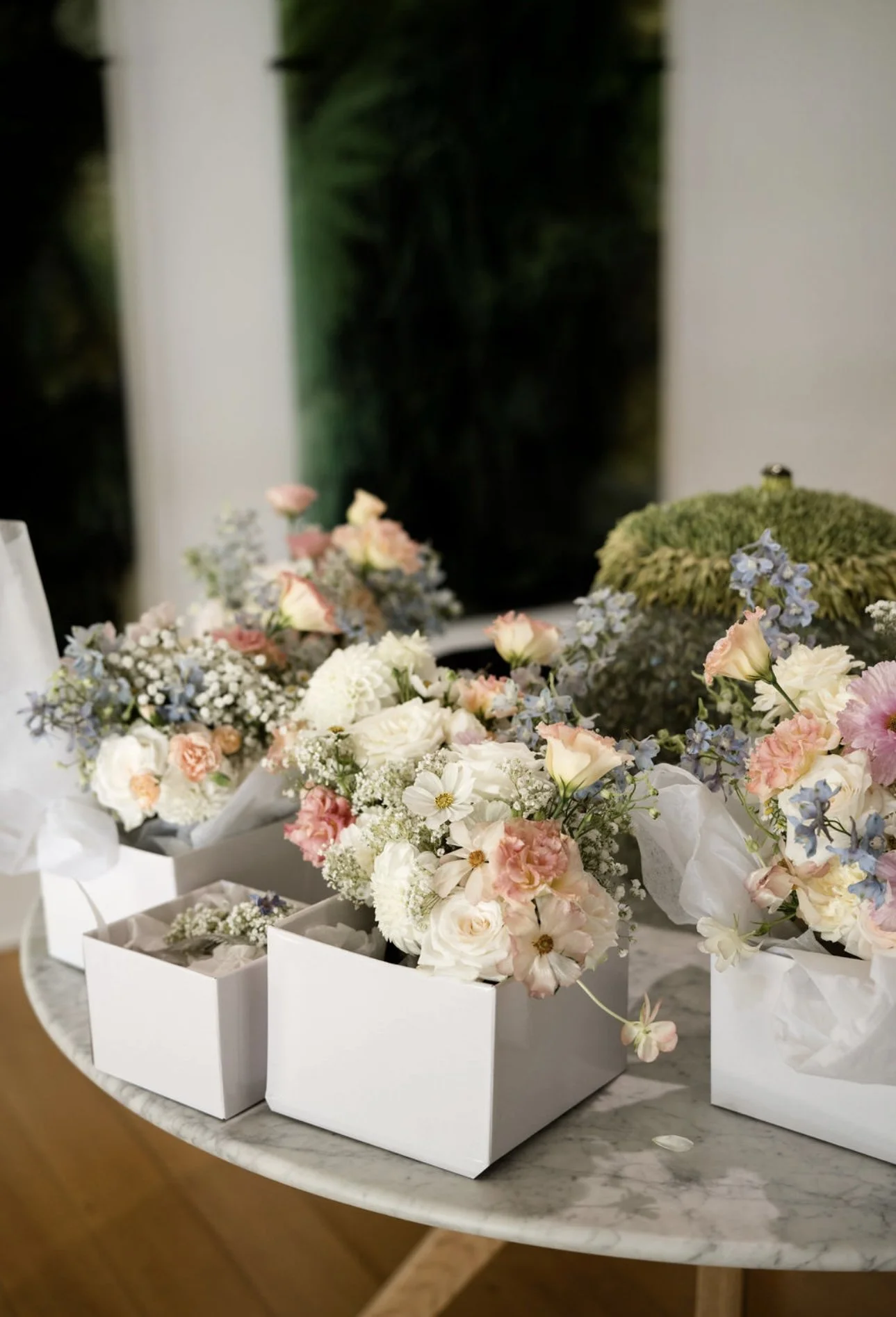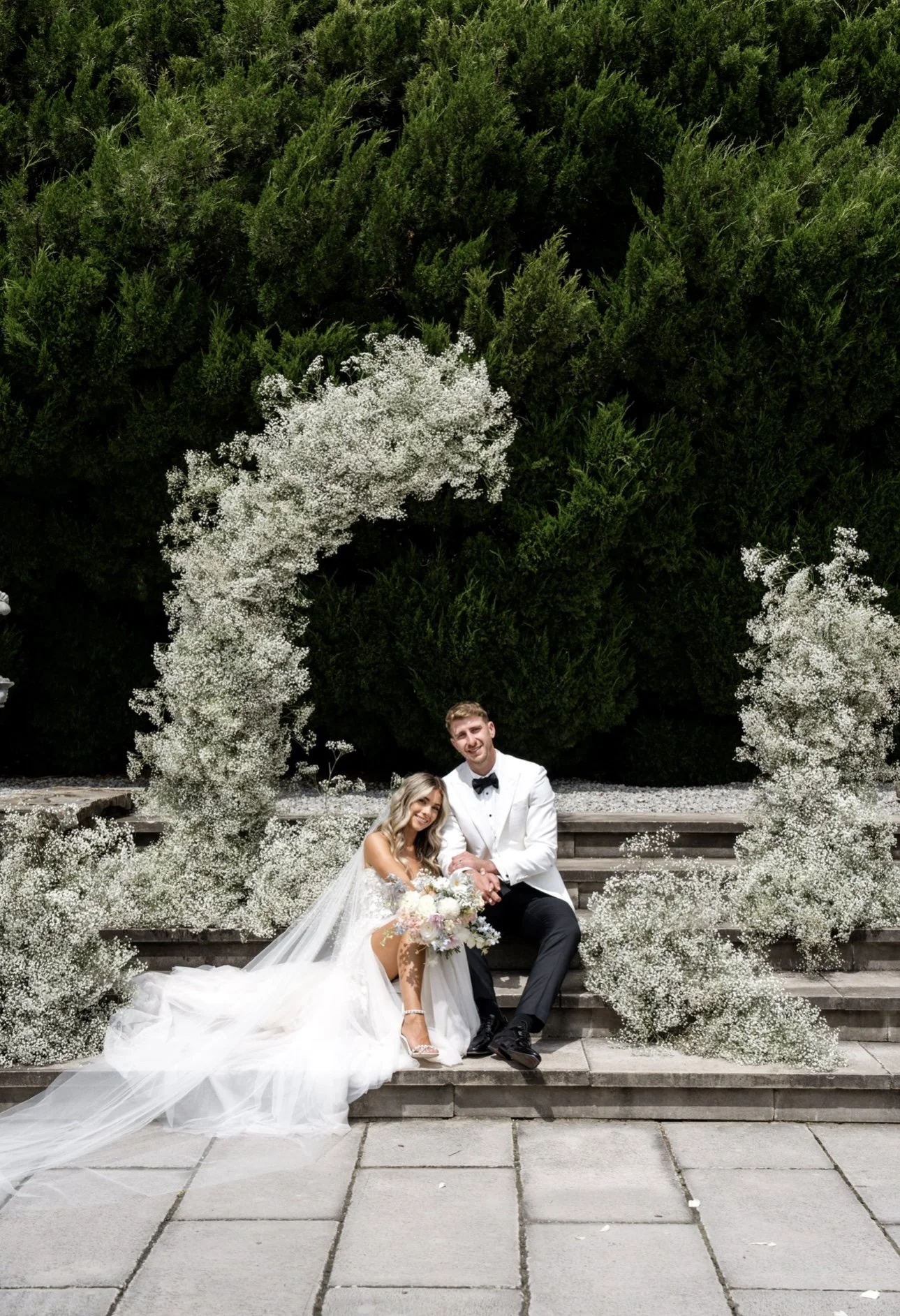 A celebration built on texture, colour, and creative freedom. Soft, cloud-like puffs of baby’s breath lined the aisle, leading to an asymmetrical arbour that served as the ceremony’s dramatic sculptural centrepiece. Vibrant, colourful bouquets added a playful contrast to the delicate white blooms. Every floral element from the ceremony was thoughtfully repurposed for the reception, where lush white roses and reimagined baby’s breath installations created a cohesive, romantic atmosphere with just the right touch of boldness.