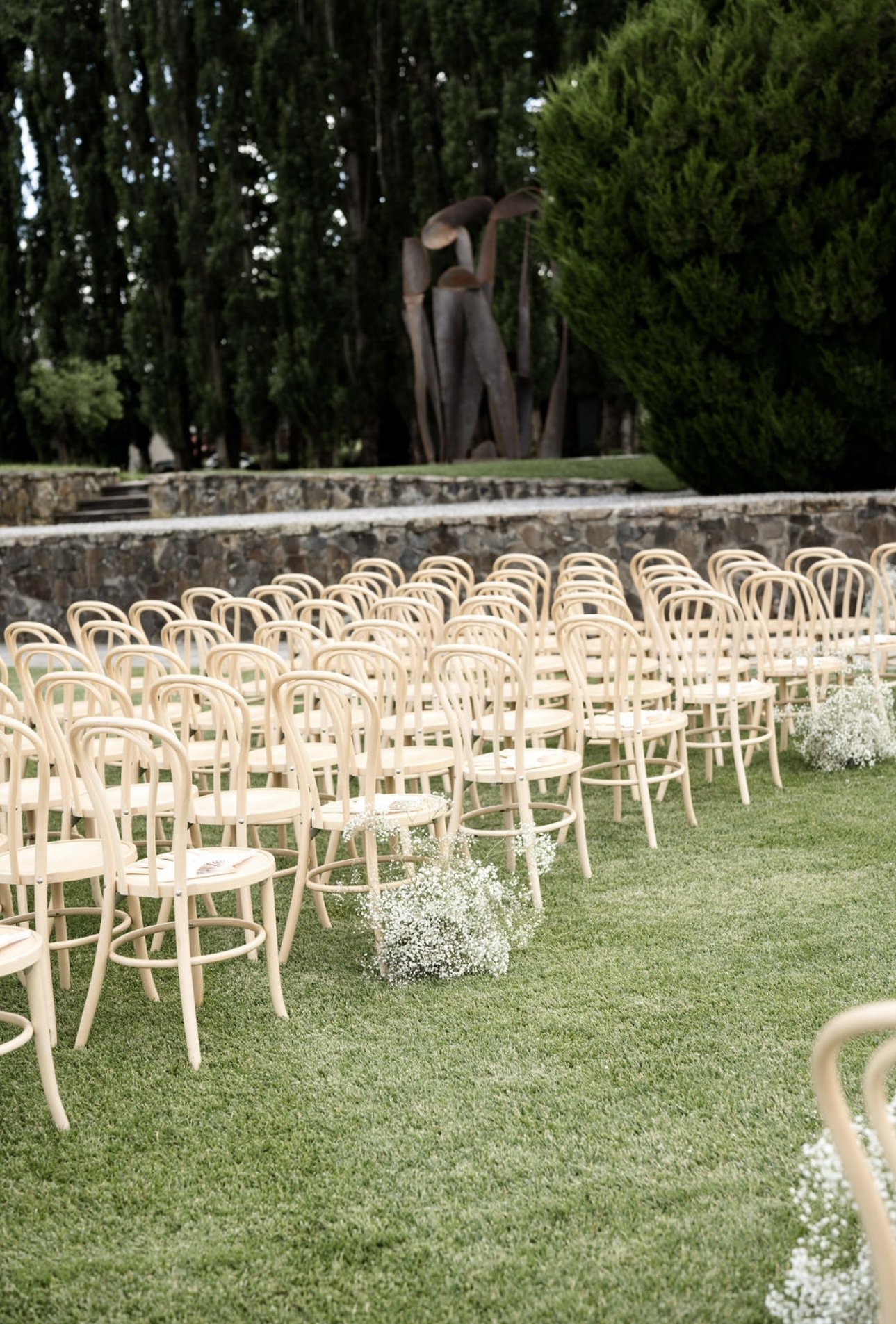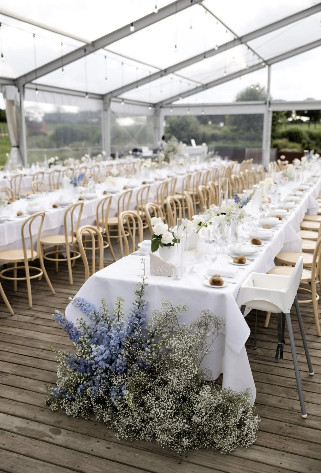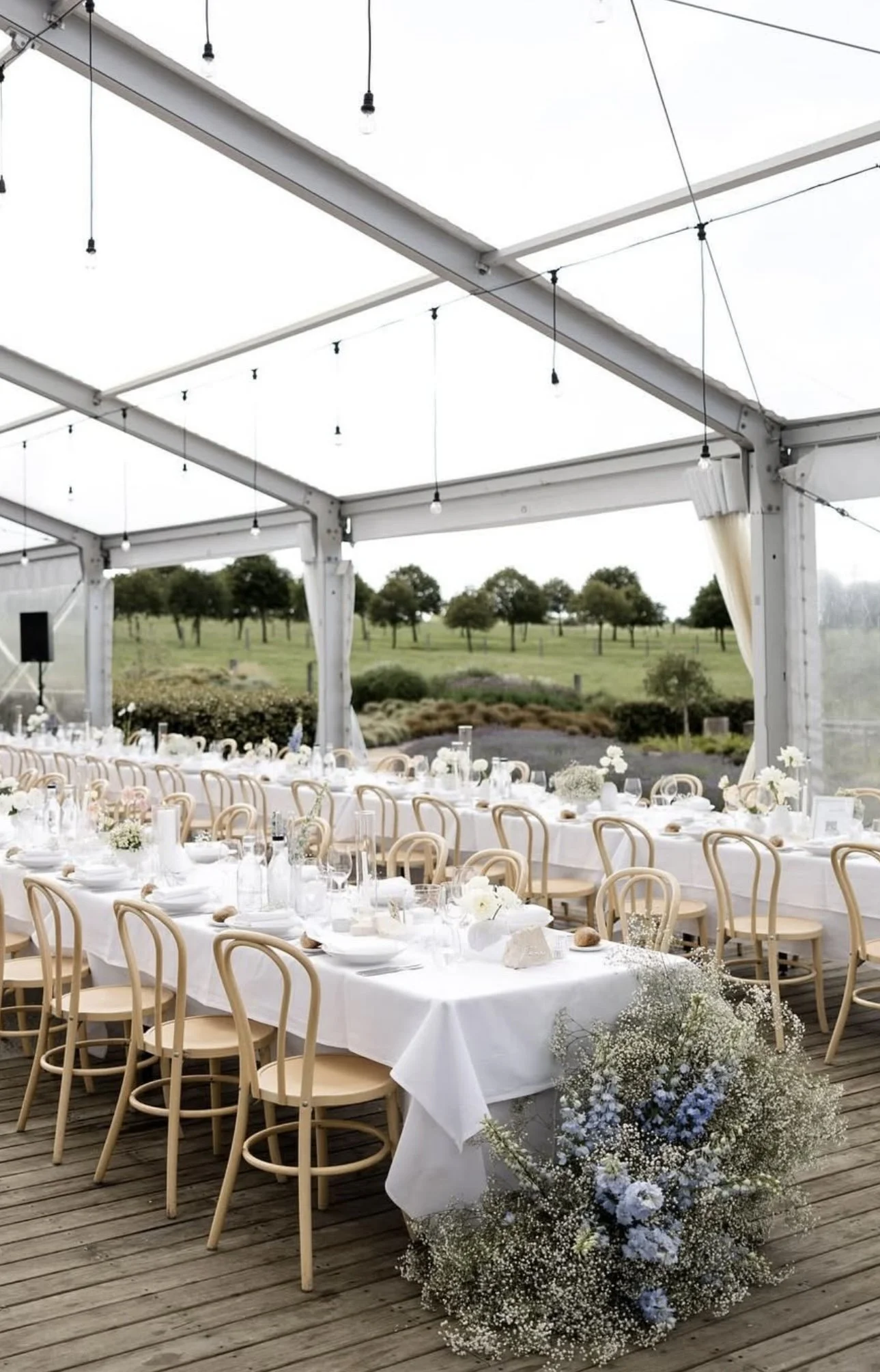 A celebration built on texture, colour, and creative freedom. Soft, cloud-like puffs of baby’s breath lined the aisle, leading to an asymmetrical arbour that served as the ceremony’s dramatic sculptural centrepiece. Vibrant, colourful bouquets added a playful contrast to the delicate white blooms. Every floral element from the ceremony was thoughtfully repurposed for the reception, where lush white roses and reimagined baby’s breath installations created a cohesive, romantic atmosphere with just the right touch of boldness.