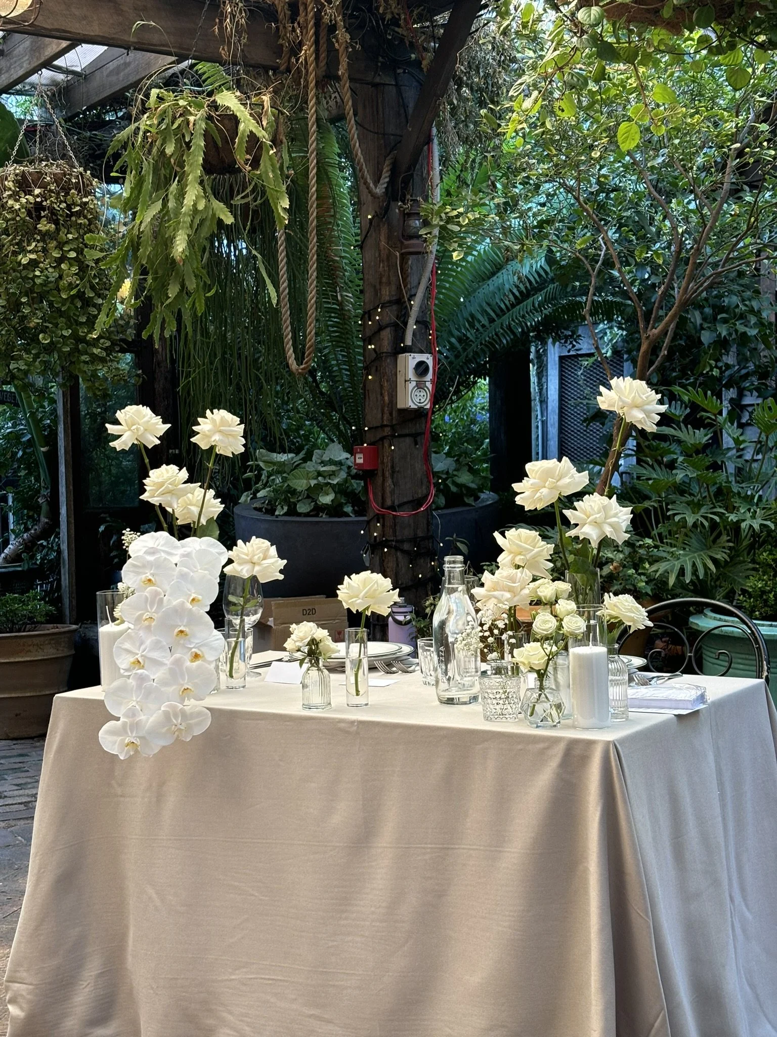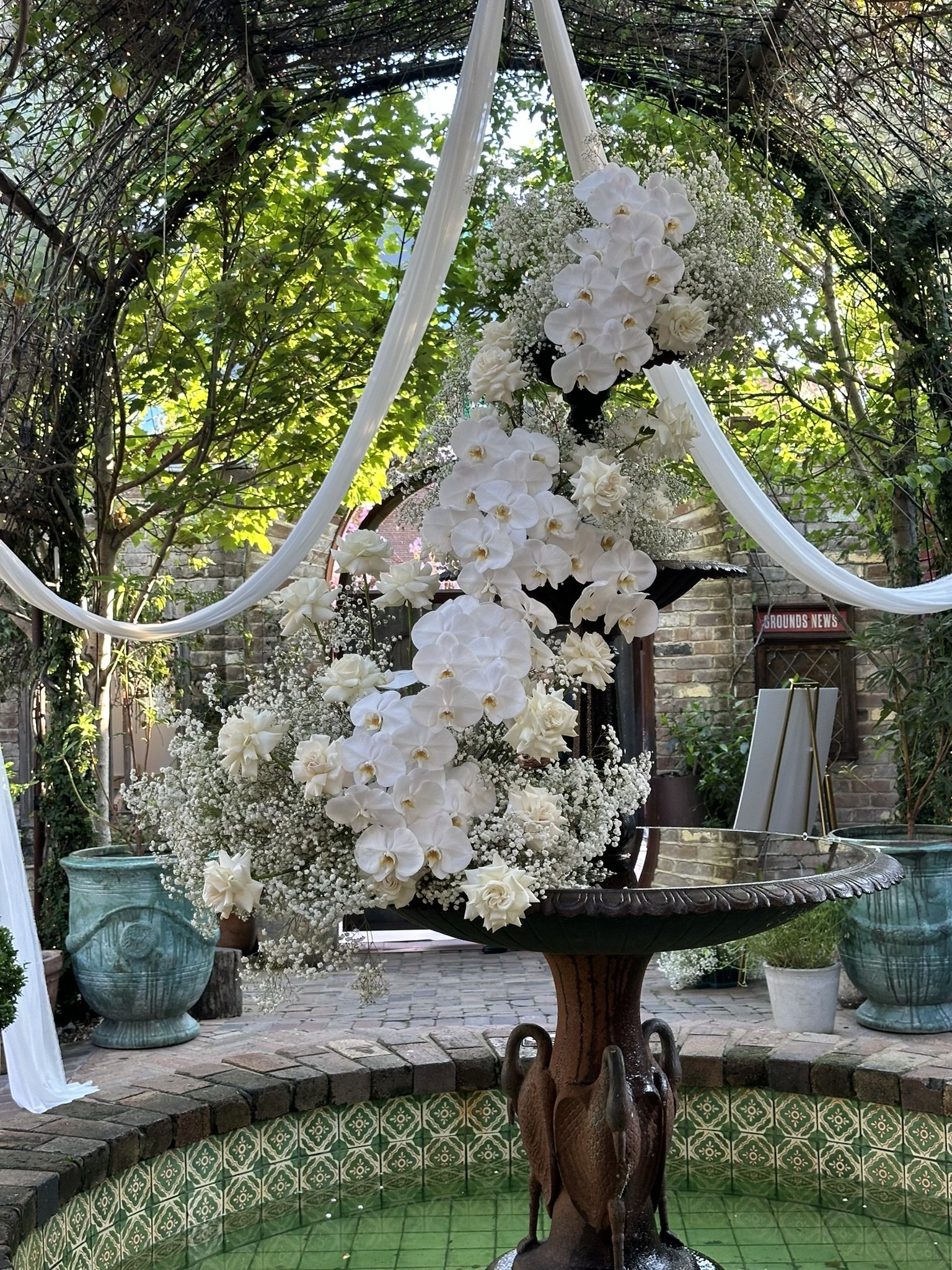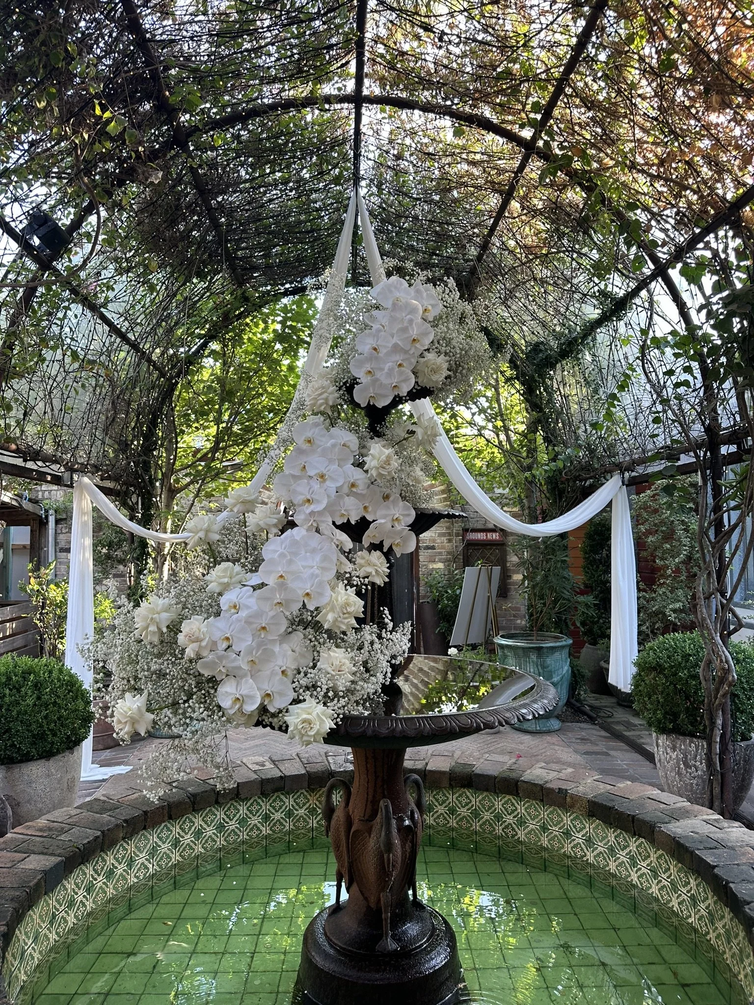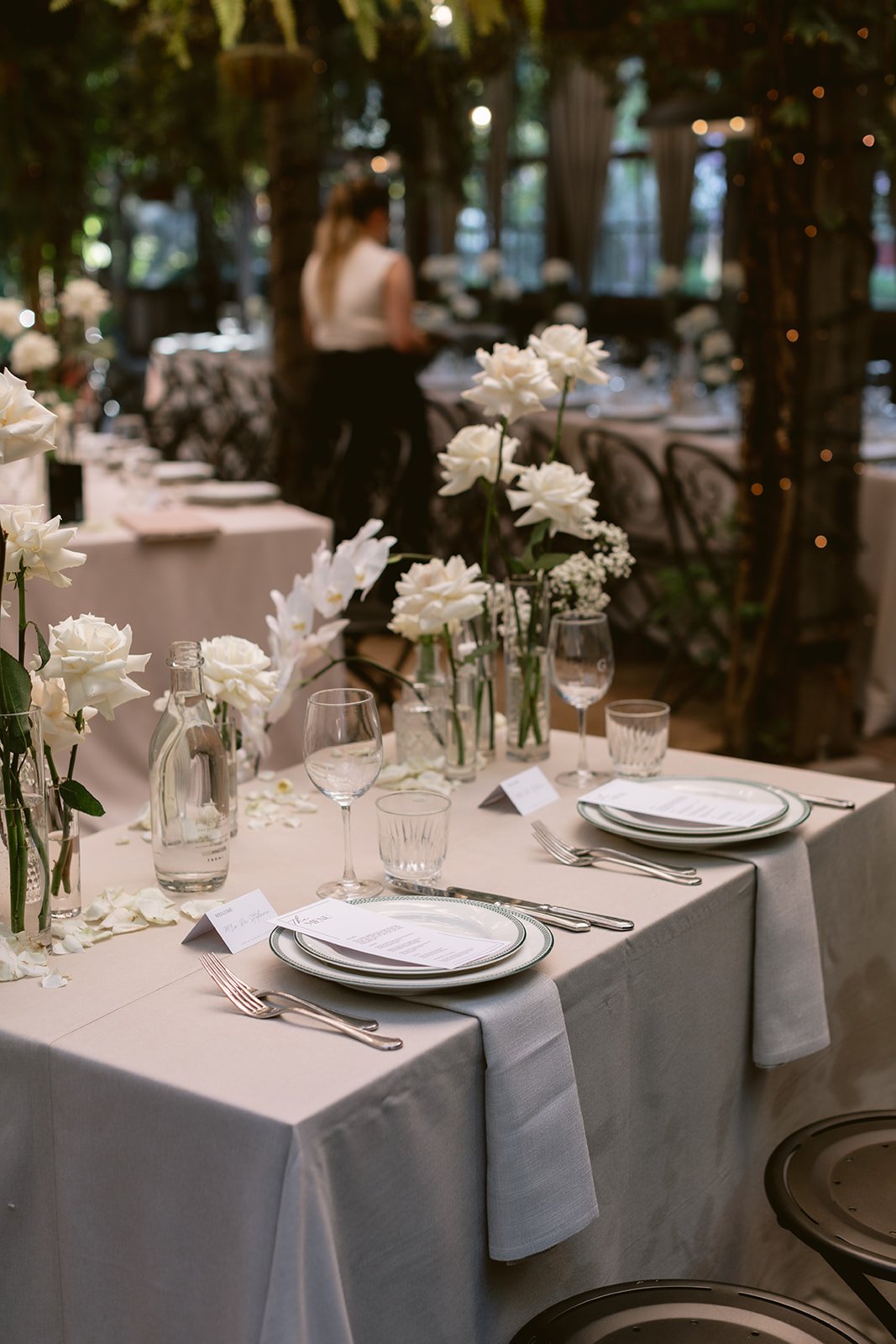 Their wedding carried a minimal, modern aesthetic. White roses and baby’s breath in slim bud vases sat against soft greenery, echoing the venue’s textures. The fountain installation was framed with understated draping and chandeliers to enhance, not overshadow, the setting. After the ceremony, florals were moved to the sweetheart table so the couple dined surrounded by the same crisp, elegant palette.