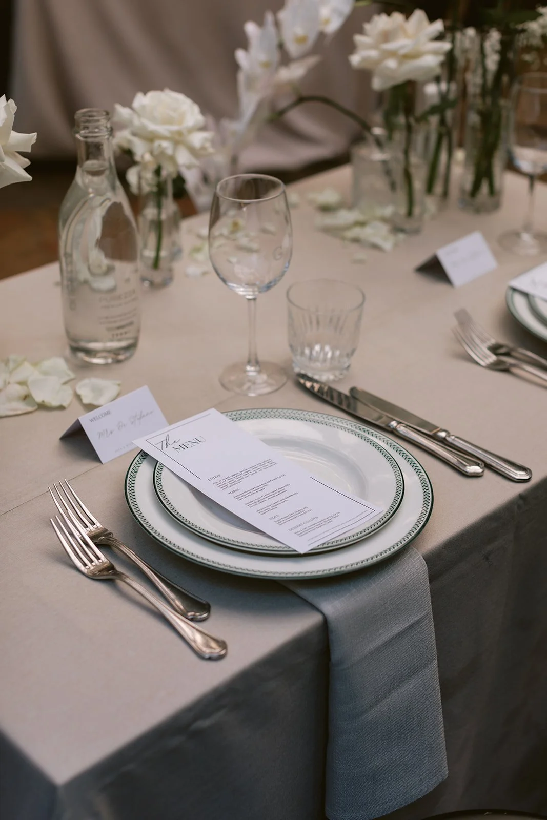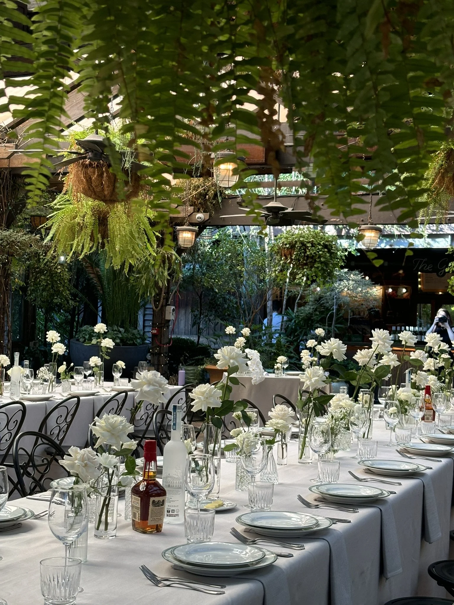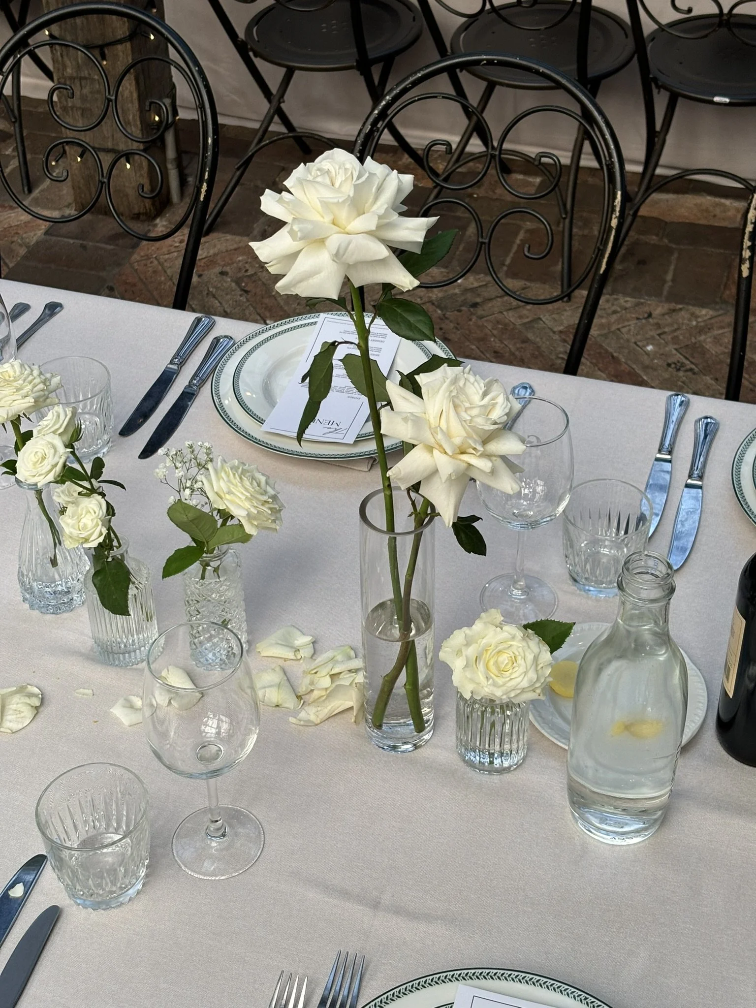 Their wedding carried a minimal, modern aesthetic. White roses and baby’s breath in slim bud vases sat against soft greenery, echoing the venue’s textures. The fountain installation was framed with understated draping and chandeliers to enhance, not overshadow, the setting. After the ceremony, florals were moved to the sweetheart table so the couple dined surrounded by the same crisp, elegant palette.