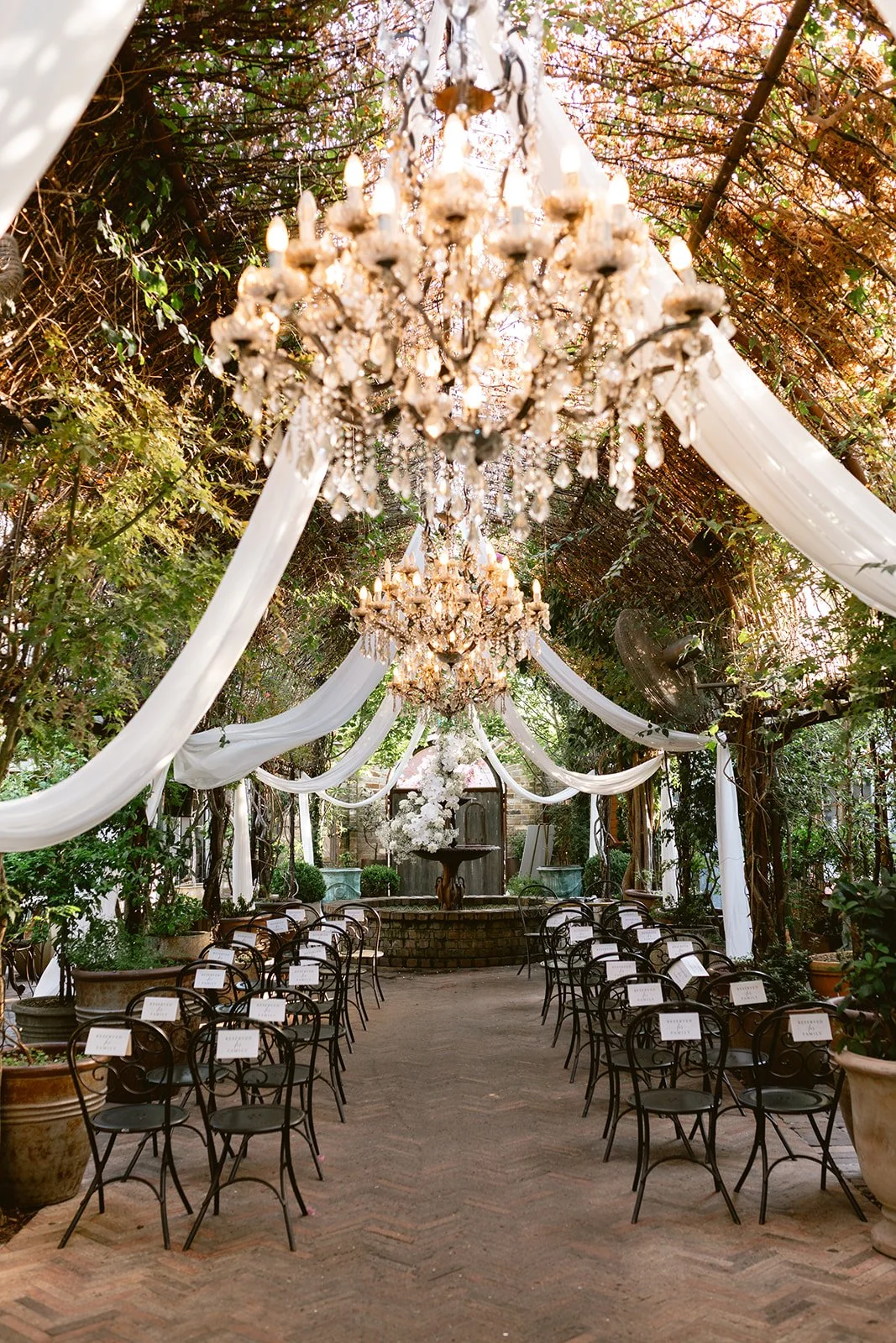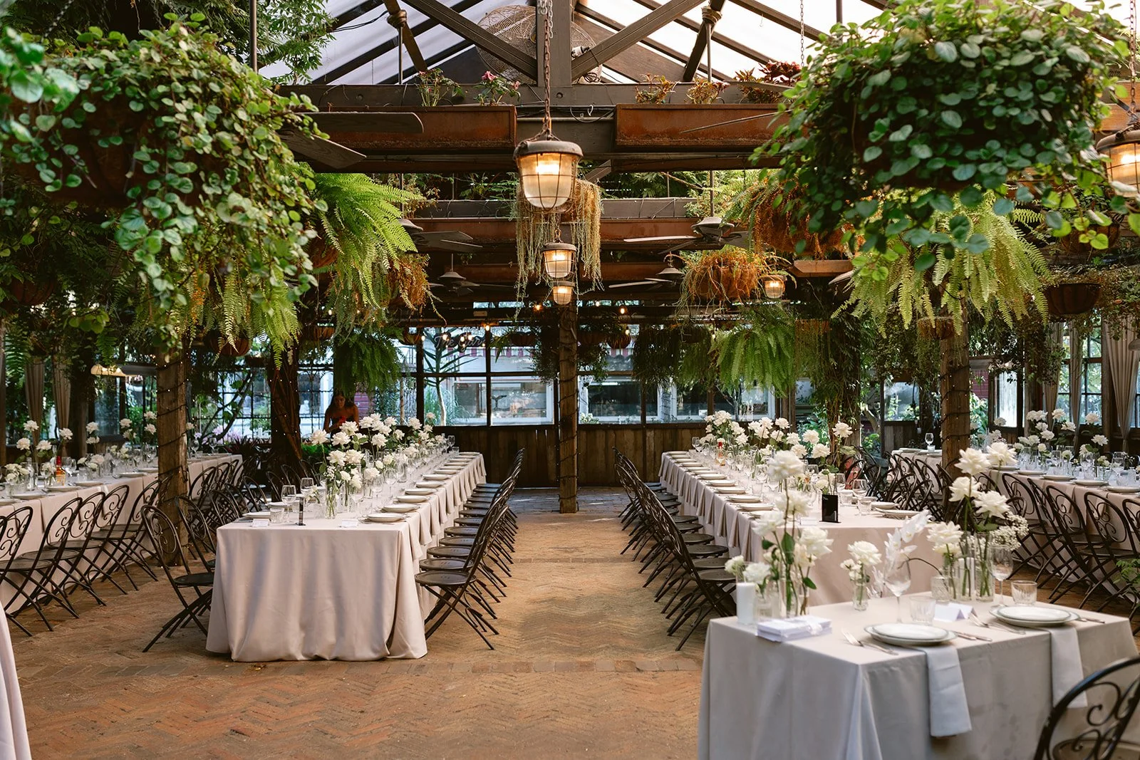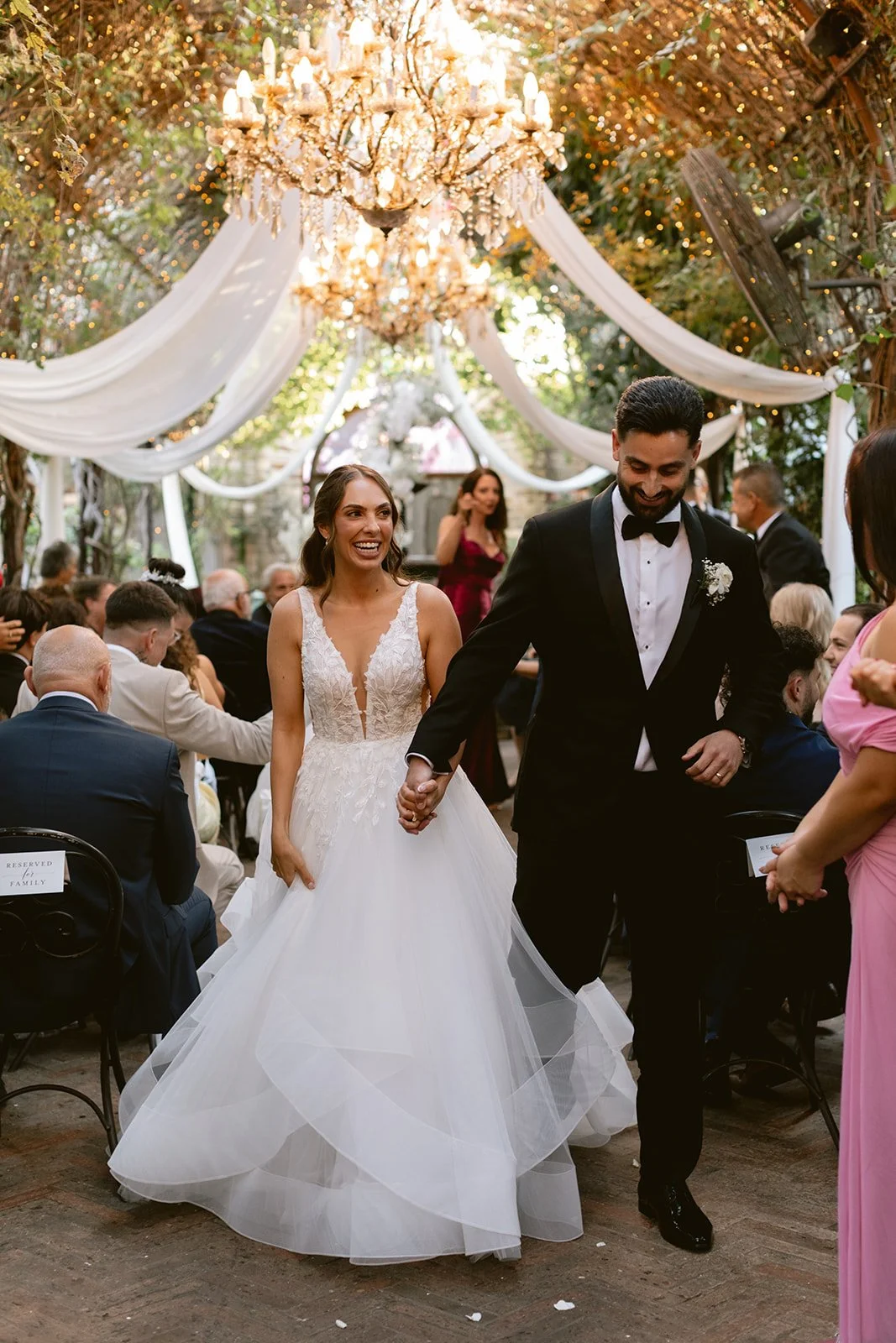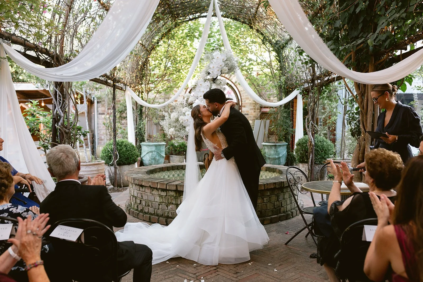 Their wedding carried a minimal, modern aesthetic. White roses and baby’s breath in slim bud vases sat against soft greenery, echoing the venue’s textures. The fountain installation was framed with understated draping and chandeliers to enhance, not overshadow, the setting. After the ceremony, florals were moved to the sweetheart table so the couple dined surrounded by the same crisp, elegant palette.